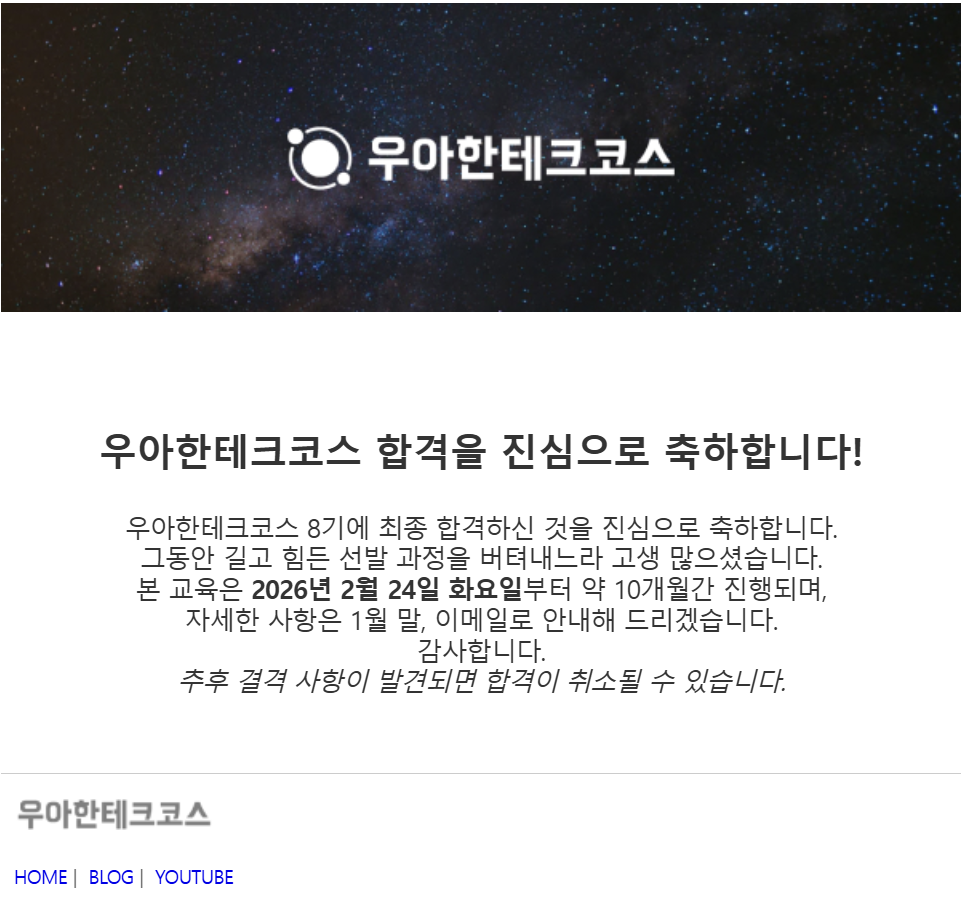 | [우아한 테크 코스 8기] 최종 합격 (0) | 2026.01.23 |