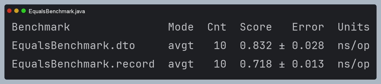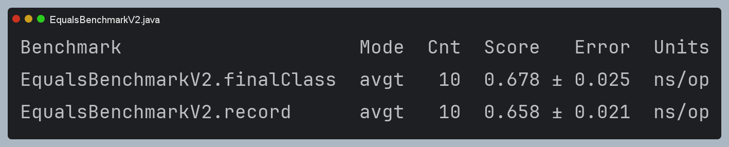 record의 equals() inline최적화가 된다면, record가 약소하게 더 빠른 걸 확인할 수 있다.